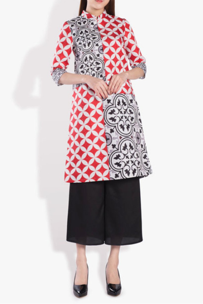 Màu sắc: Đỏ – trắng – đen, họa tiết gạch bông và hoa văn cổ điển in trên nền vải